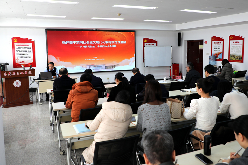 山西省委党校丰存斌教授应邀以“确保基本实现社会主义现代化取得决定性进展——学习贯彻党的二十届四中全会精神”为题作专题授课辅导。田云飞、石宇、袁伟业、郝旭燕、宏蕊5位教师分别围绕全会精神融入各门思政课和专题章节内容展开交流。