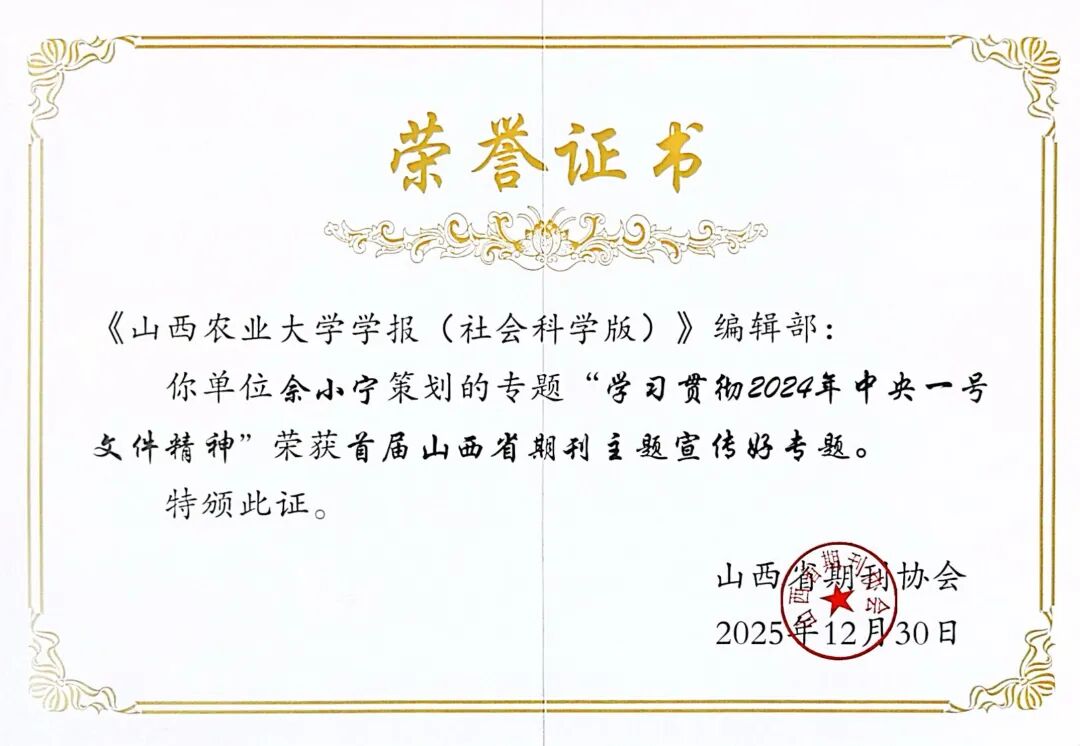 在“山西省期刊主题宣传‘好专题’”评选中,《学报》精心策划的“学习贯彻2024年中央一号文件精神”专题成功入选。该专题紧紧围绕国家“三农”工作战略部署,聚焦乡村振兴、农业高质量发展等关键议题,汇集了国内相关领域专家学者的前沿研究成果,通过系统的理论阐释与实践探索,为政策落地见效提供了有力的学术支撑,充分彰显了《学报》服务农业农村发展的责任与担当。