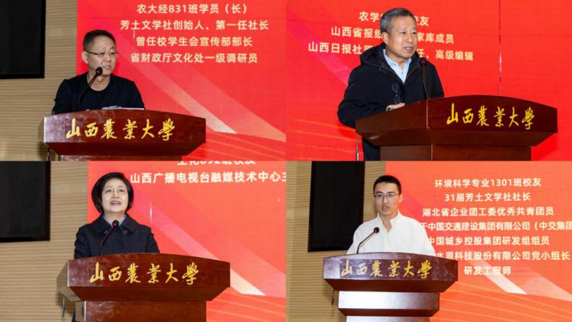在嘉宾分享环节,创办芳土文学社的发起人张晓峰生动讲述了当年秋夜张贴启事、创办社团的峥嵘岁月,再现了当年农大学子对文学的纯粹热爱与执着追求;徐补生结合自身成长,阐述了文学如何拓宽生命视野,并殷切寄语学子“爱读书、读好书、善读书”;李丽以“沃土知道,小草记得”为题,感恩文学社赋予她的成长底色与表达能力;贾泽清分享了从社团锻炼中收获的“责任心”与“匠心”,指引其科技报国之路,展现了文理交融的新时代芳土人形象。