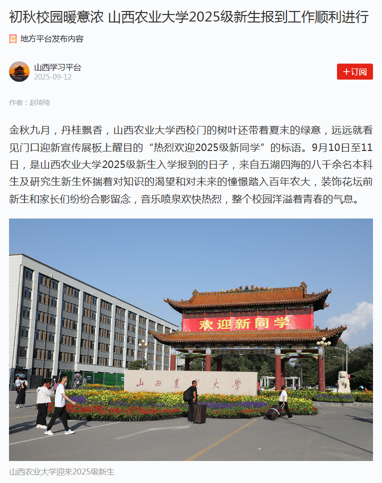 金秋九月,丹桂飘香,山西农业大学西校门的树叶还带着夏末的绿意,远远就看见门口迎新宣传展板上醒目的“热烈欢迎2025级新同学”的标语。9月10日至11日,是山西农业大学2025级新生入学报到的日子,来自五湖四海的八千余名本科生及研究生新生怀揣着对知识的渴望和对未来的憧憬踏入百年农大,装饰花坛前新生和家长们纷纷合影留念,音乐喷泉欢快热烈,整个校园洋溢着青春的气息。
