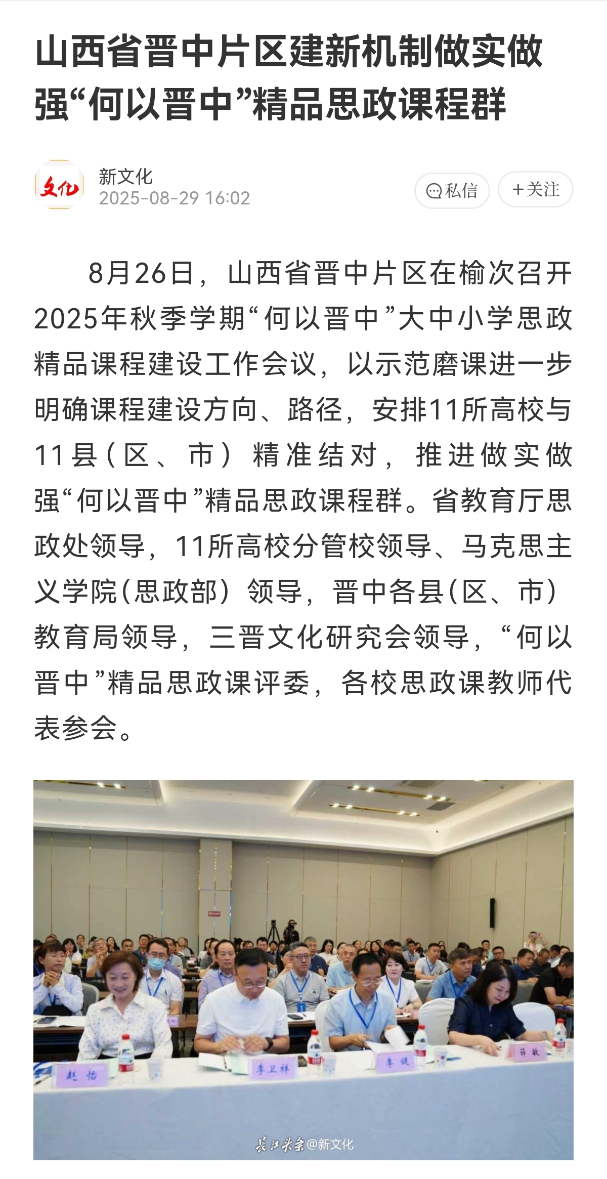 8月26日,山西省晋中片区在榆次召开2025年秋季学期“何以晋中”大中小学思政精品课程建设工作会议,以示范磨课进一步明确课程建设方向、路径,安排11所高校与11县(区、市)精准结对,推进做实做强“何以晋中”精品思政课程群。省教育厅思政处领导,11所高校分管校领导、马克思主义学院(思政部)领导,晋中各县(区、市)教育局领导,三晋文化研究会领导,“何以晋中”精品思政课评委,各校思政课教师代表参会。