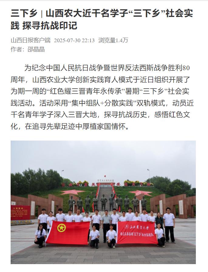 为纪念中国人民抗日战争暨世界反法西斯战争胜利80周年,山西农业大学创新实践育人模式于近日组织开展了为期一周的“红色耀三晋青年永传承”暑期“三下乡”社会实践活动。活动采用“集中组队+分散实践”双轨模式,动员近千名青年学子深入三晋大地,探寻抗战历史,感悟红色文化,在追寻先辈足迹中厚植家国情怀。