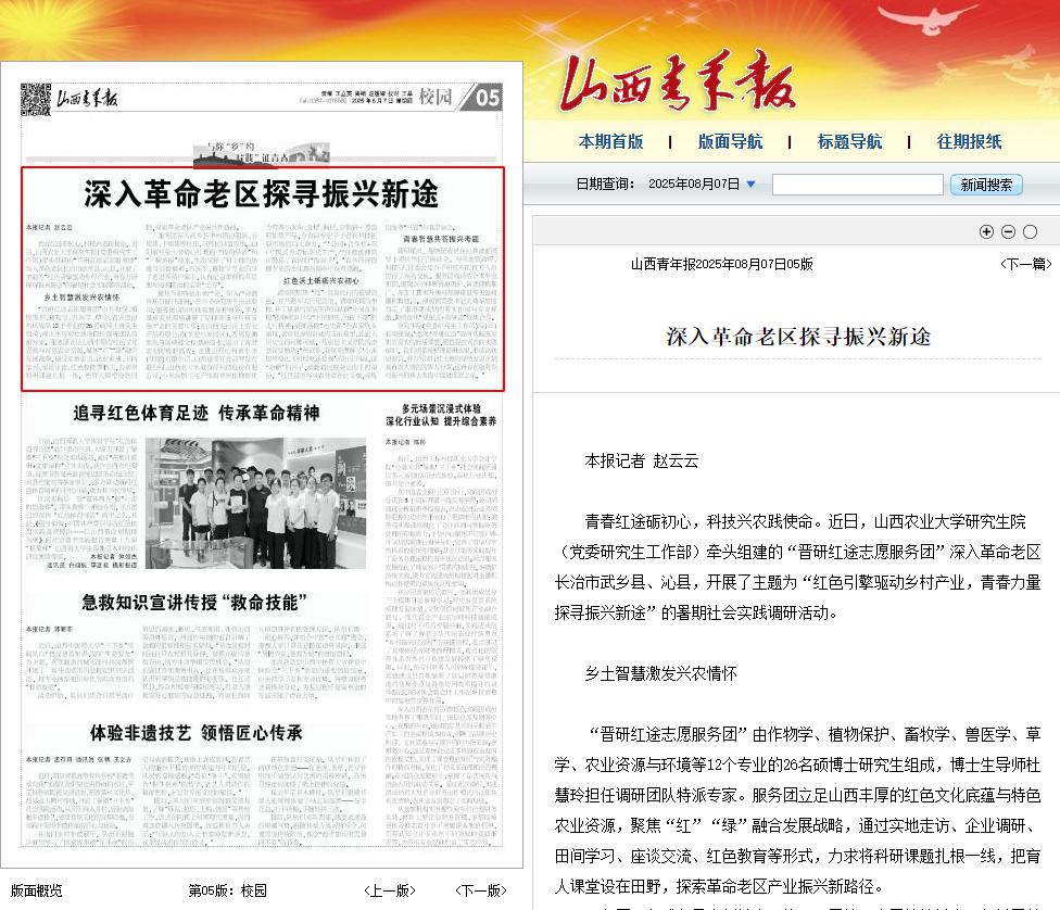 青春红途砺初心,科技兴农践使命。近日,山西农业大学研究生院(党委研究生工作部)牵头组建的“晋研红途志愿服务团”深入革命老区长治市武乡县、沁县,开展了主题为“红色引擎驱动乡村产业,青春力量探寻振兴新途”的暑期社会实践调研活动。