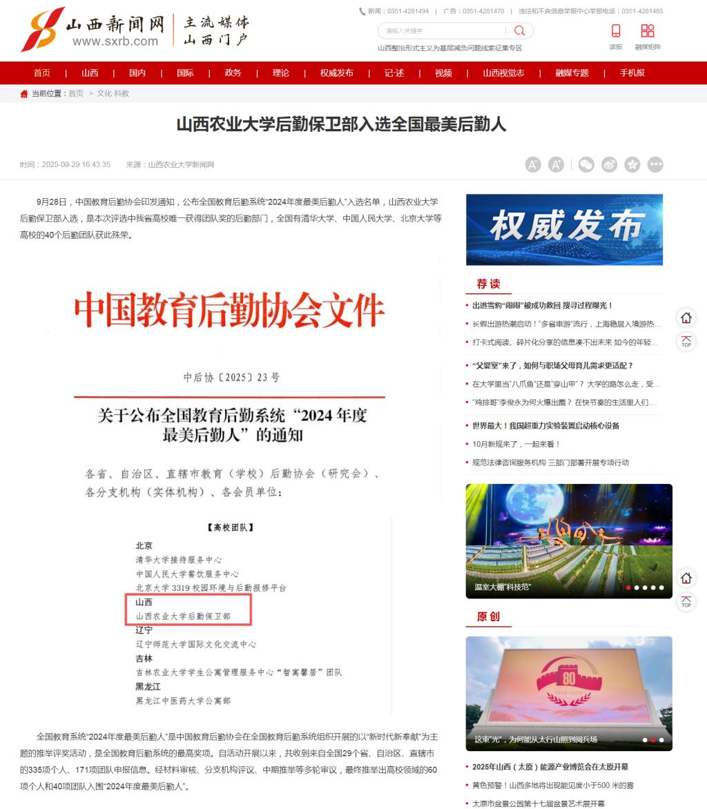 9月28日,中国教育后勤协会印发通知,公布全国教育后勤系统“2024年度最美后勤人”入选名单,山西农业大学后勤保卫部入选,是本次评选中我省高校唯一获得团队奖的后勤部门,全国有清华大学、中国人民大学、北京大学等高校的40个后勤团队获此殊荣。