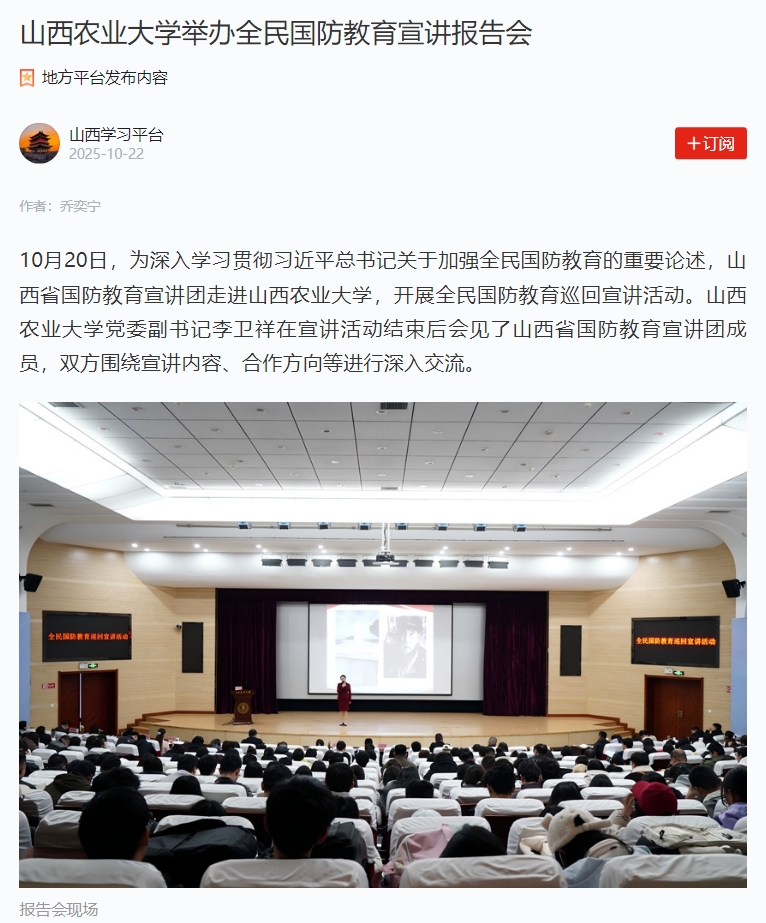 10月20日,为深入学习贯彻习近平总书记关于加强全民国防教育的重要论述,山西省国防教育宣讲团走进山西农业大学,开展全民国防教育巡回宣讲活动。山西农业大学党委副书记李卫祥在宣讲活动结束后会见了山西省国防教育宣讲团成员,双方围绕宣讲内容、合作方向等进行深入交流。