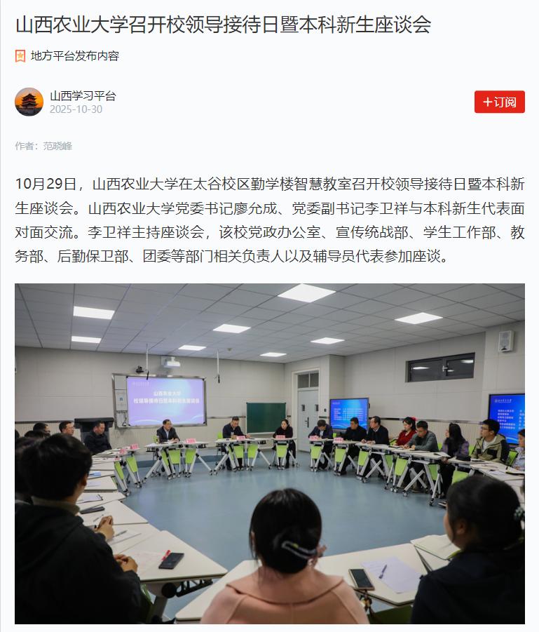 10月29日,山西农业大学在太谷校区勤学楼智慧教室召开校领导接待日暨本科新生座谈会。山西农业大学党委书记廖允成、党委副书记李卫祥与本科新生代表面对面交流。李卫祥主持座谈会,该校党政办公室、宣传统战部、学生工作部、教务部、后勤保卫部、团委等部门相关负责人以及辅导员代表参加座谈。
