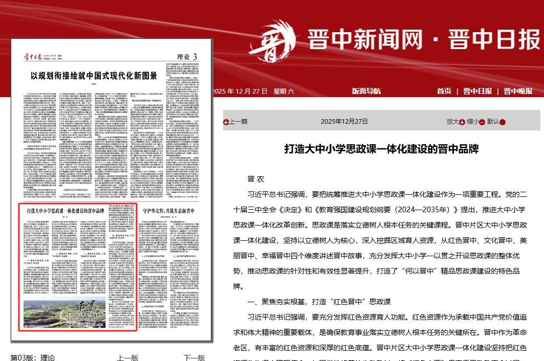 习近平总书记强调,要把统筹推进大中小学思政课一体化建设作为一项重要工程。党的二十届三中全会《决定》和《教育强国建设规划纲要(2024—2035年)》提出,推进大中小学思政课一体化改革创新。思政课是落实立德树人根本任务的关键课程。晋中片区大中小学思政课一体化建设,坚持以立德树人为核心,深入挖掘区域育人资源,从红色晋中、文化晋中、美丽晋中、幸福晋中四个维度讲述晋中故事,充分发挥大中小学一以贯之开设思政课的整体优势,推动思政课的针对性和有效性显著提升,打造了“何以晋中”精品思政课建设的特色品牌。